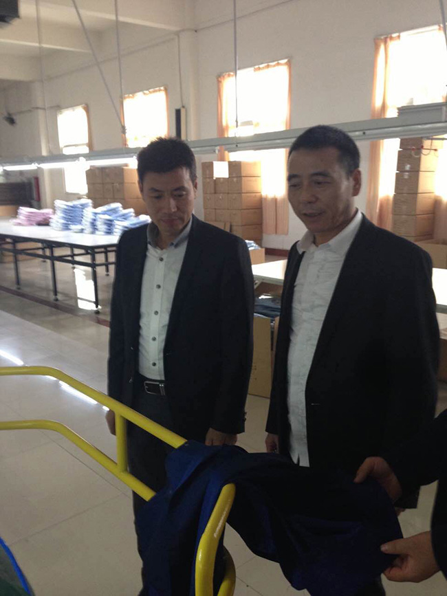 安徽豹子頭服飾有限公司董事長張光榮先生陪同報喜鳥董事長參觀公司生產(chǎn)